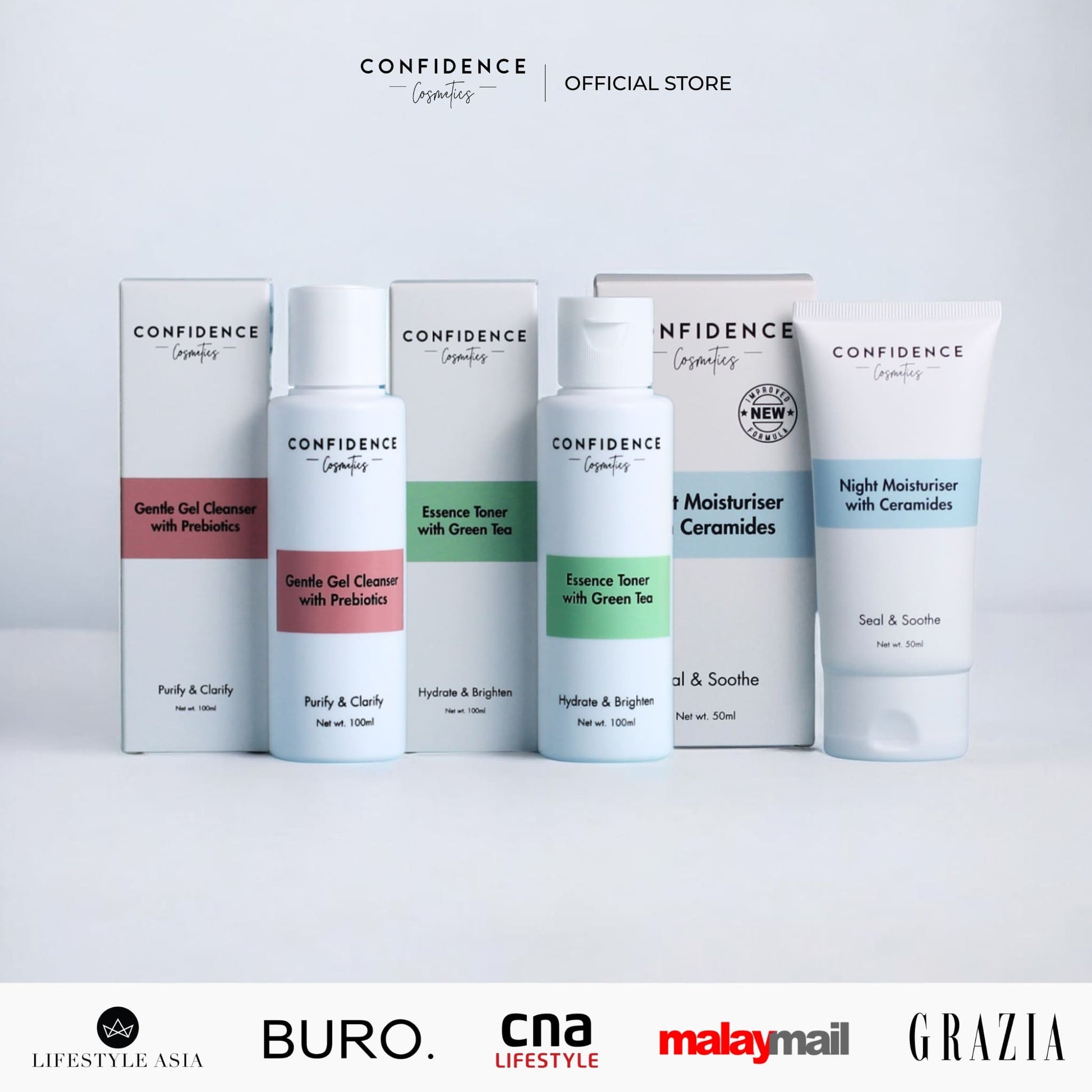 Simply use our Purify & Clarify Gentle Gel Cleanser for AM and PM, follow it up with our Hydrate & Brighten Essence Toner then seal in all the goodness with our Plump & Calm Day Moisturiser in the day and our Seal & Soothe Night Moisturiser for the night time.